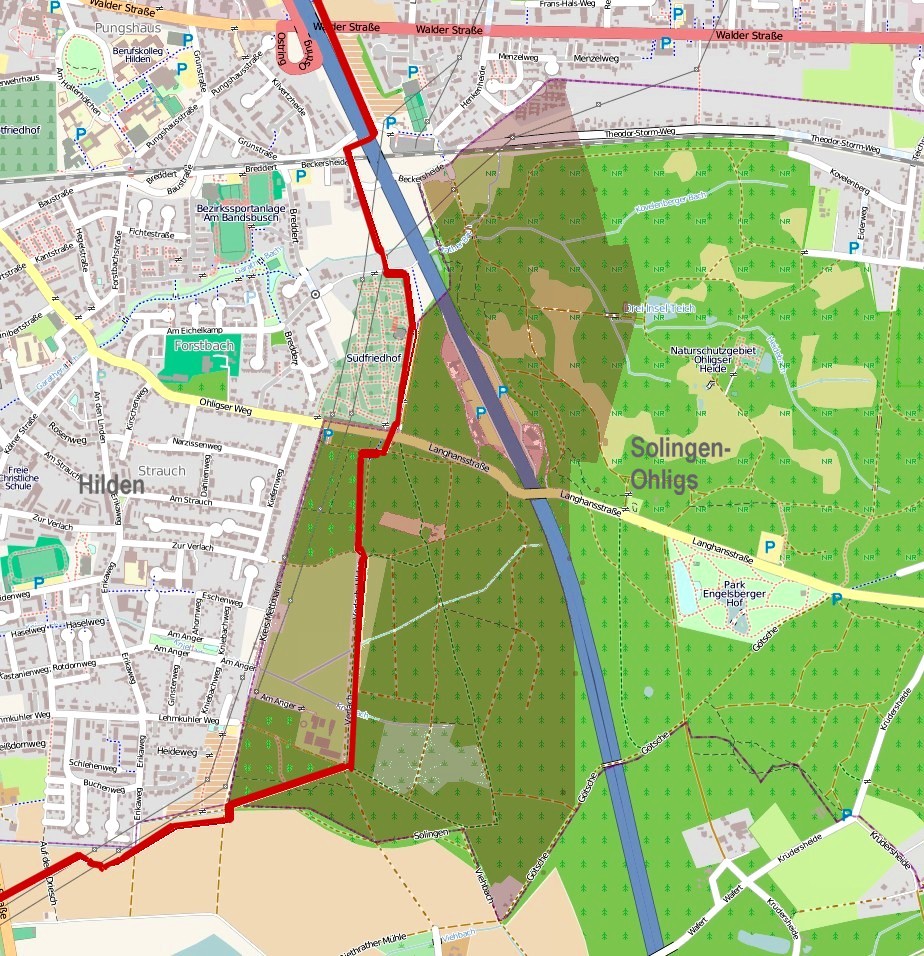 rote Linie = CO-Pipeline Die Todeszone der CO-Pipeline schraffierte Fläche = Todeszone für Solingen